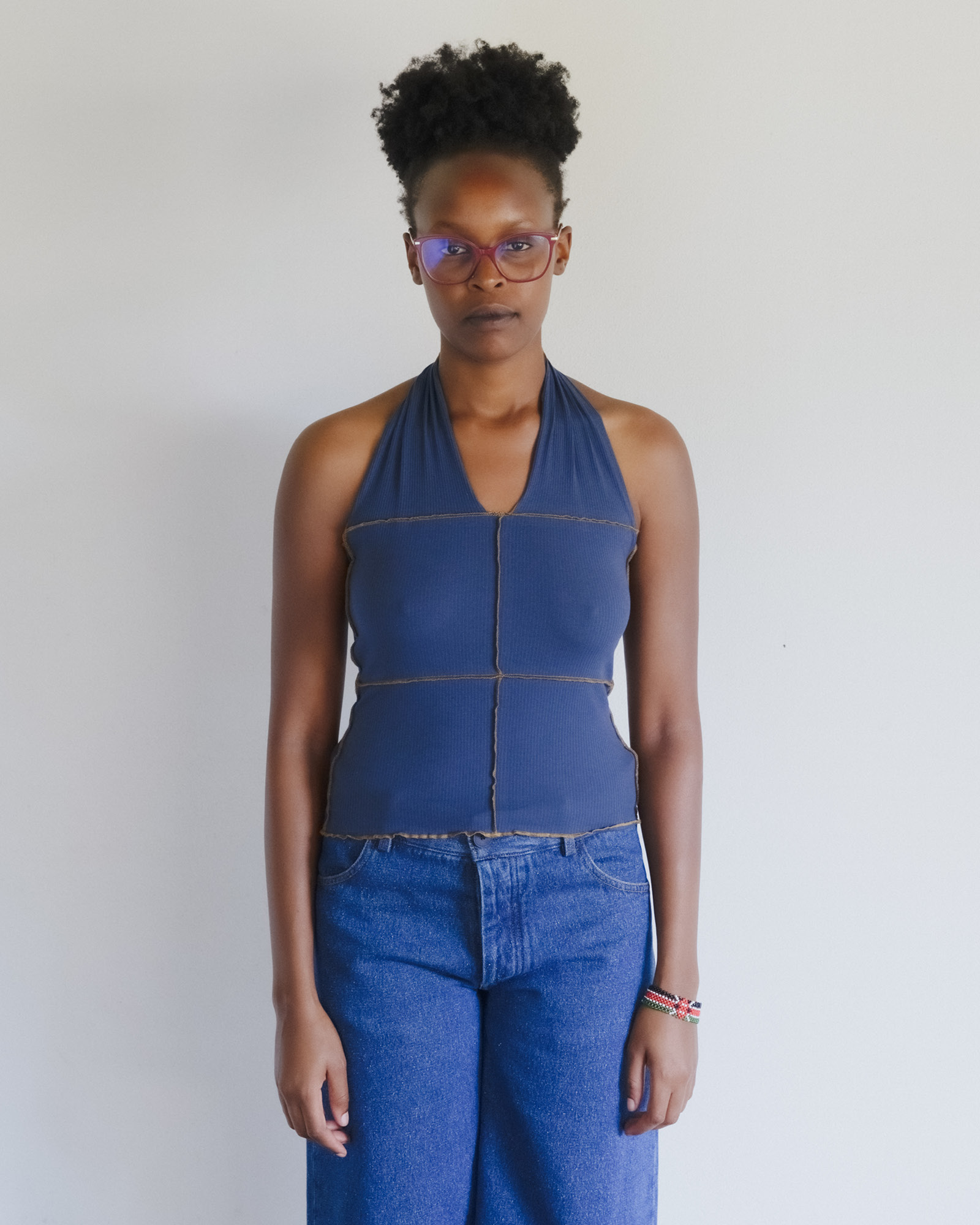 Organic cotton rib top Halter neck Exposed contrast seams Lettuce edge at hem