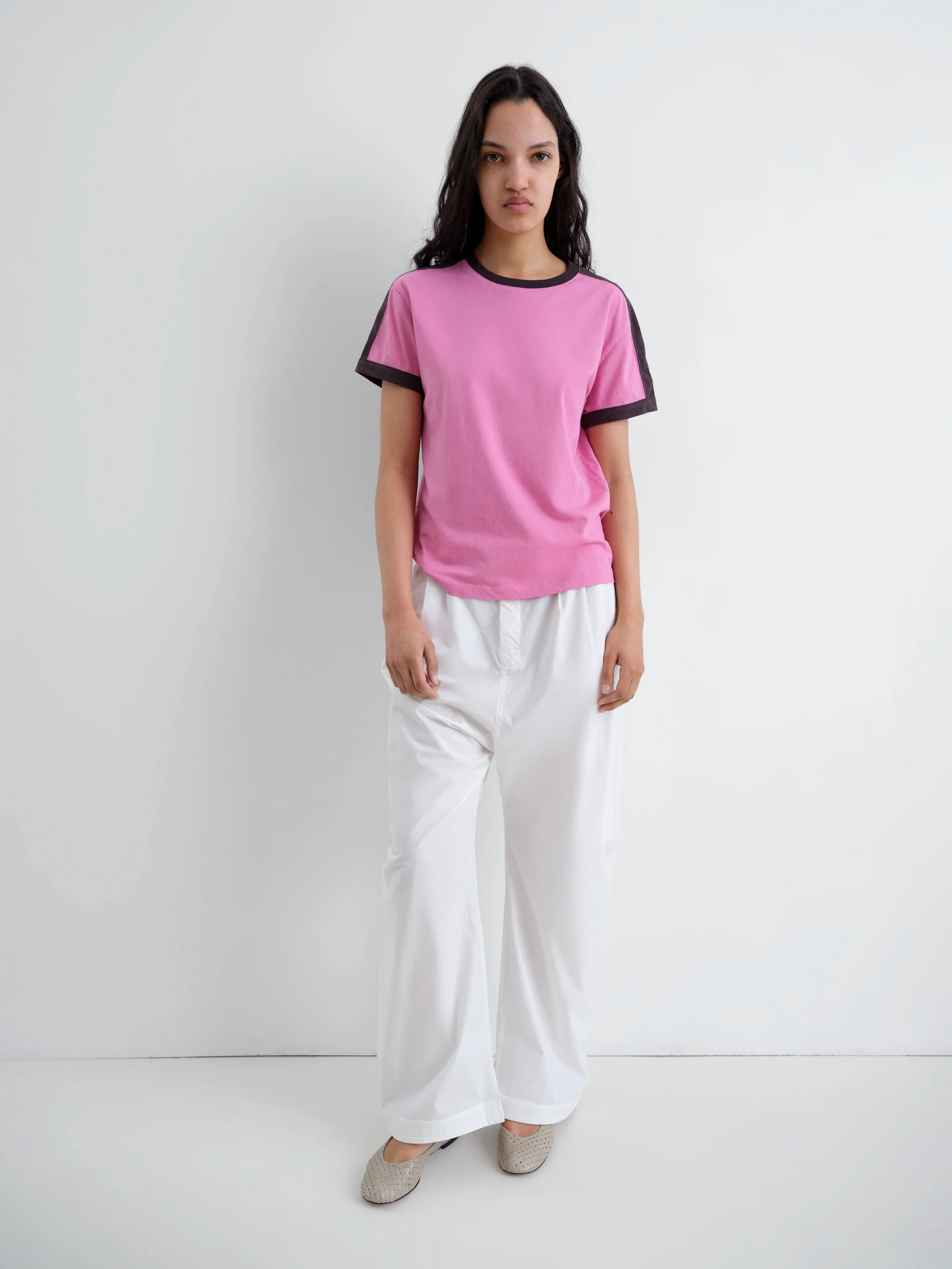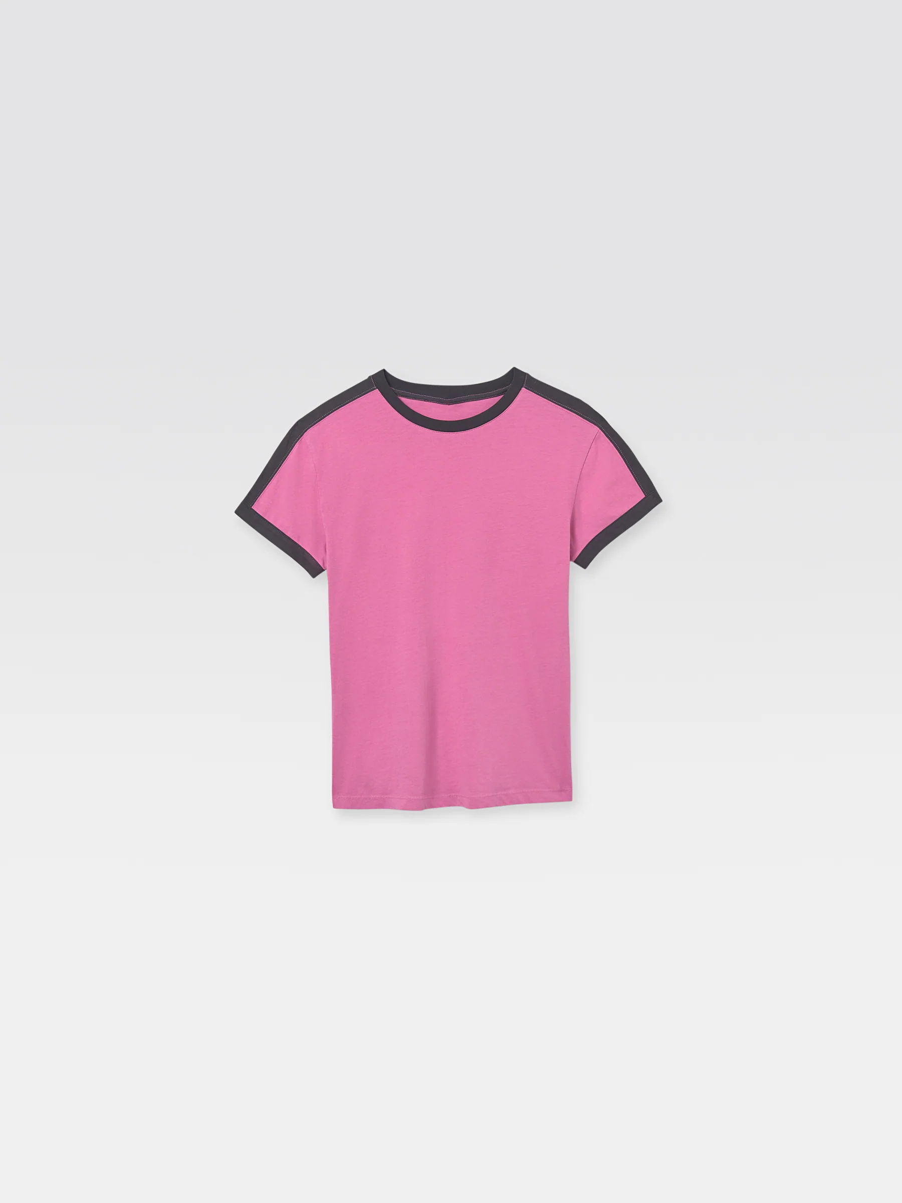 Pink and black fitted short-sleeve t-shirt. Designed for women and men with contrast details on the collar, shoulders and sleeve cuffs. Features a ribbed round neckline and a structured silhouette.