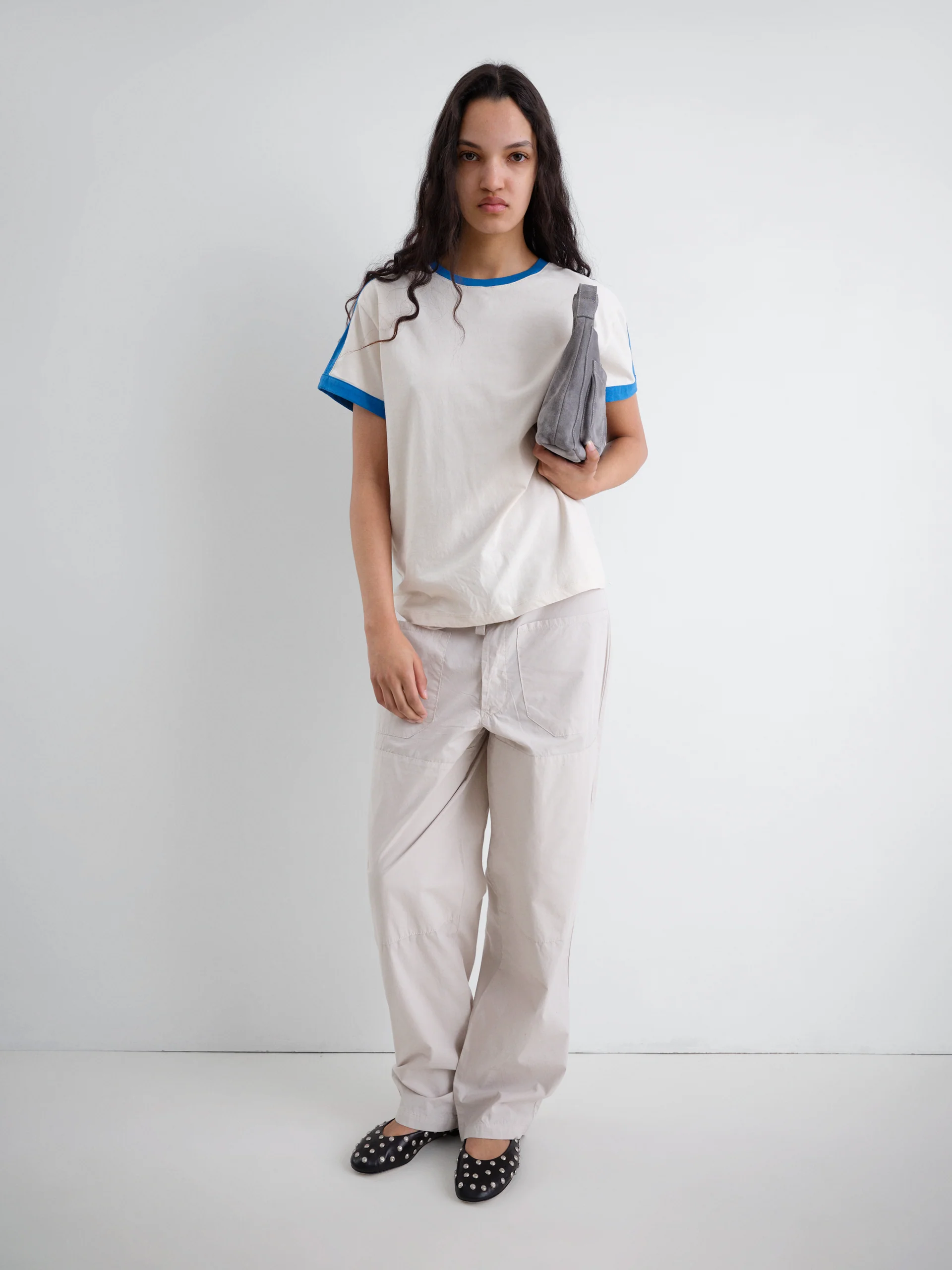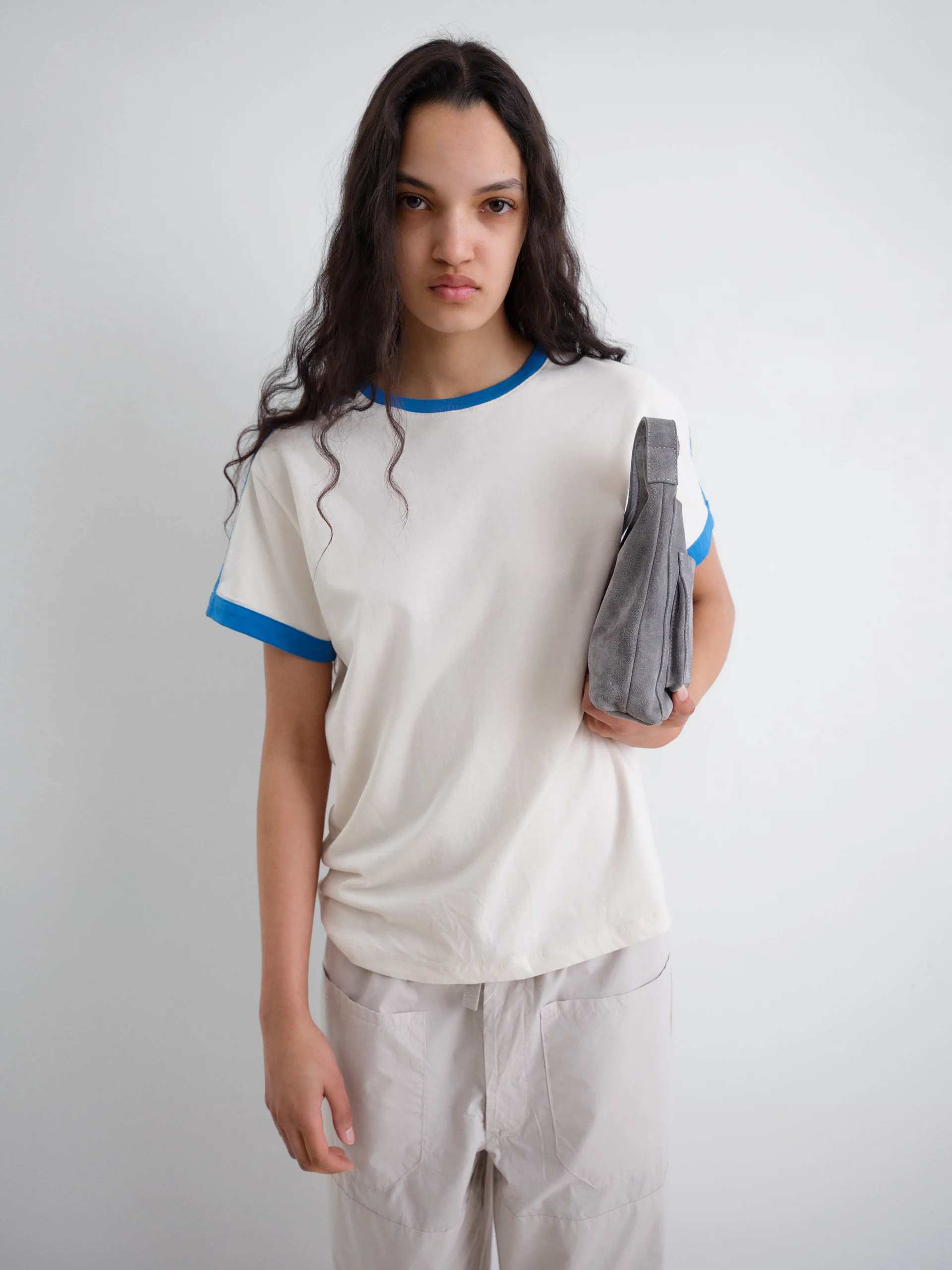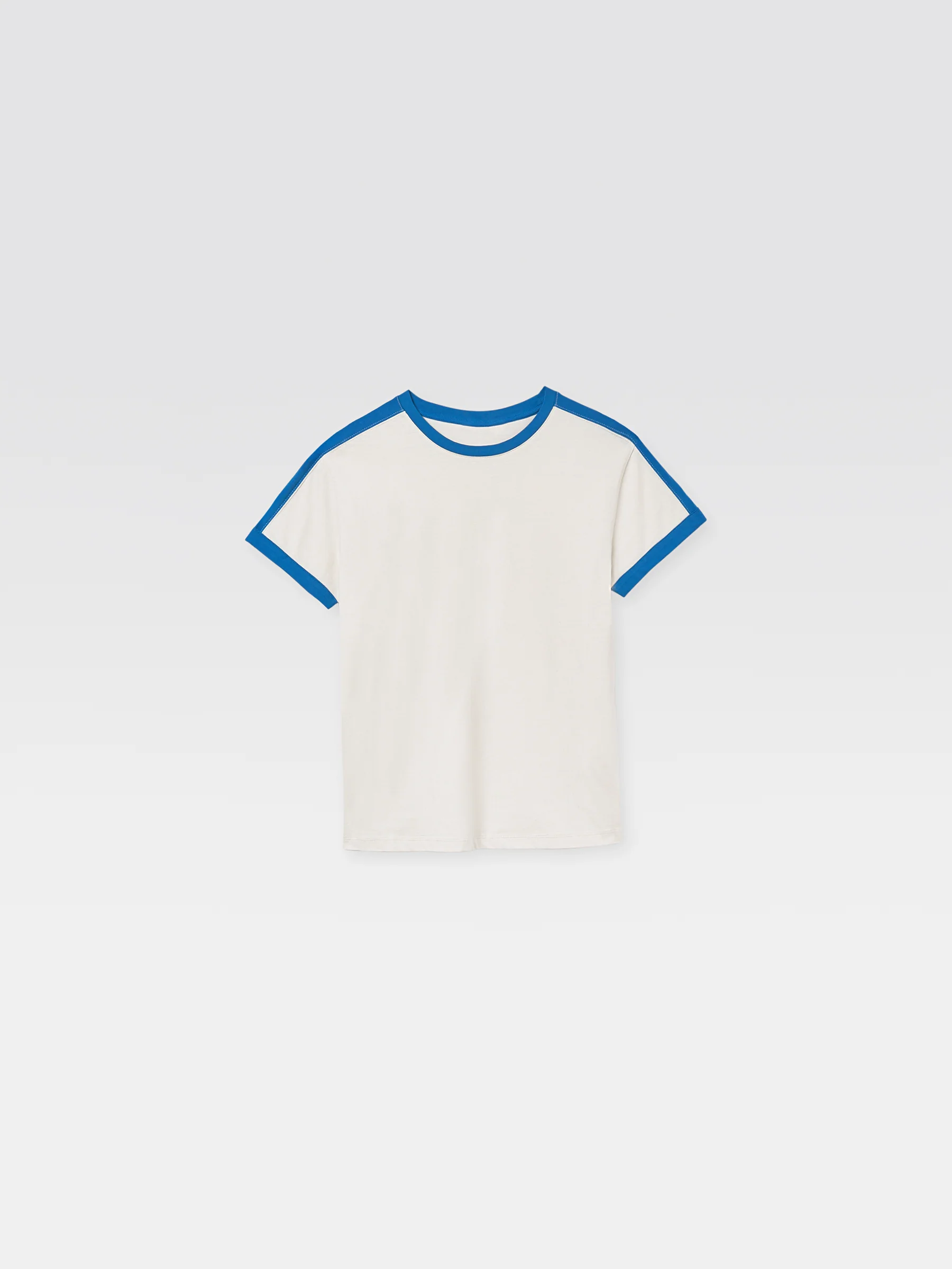 White and blue fitted short-sleeve t-shirt. Designed for women and men with contrast details on the collar, shoulders and sleeve cuffs. Features a ribbed round neckline and a structured silhouette.