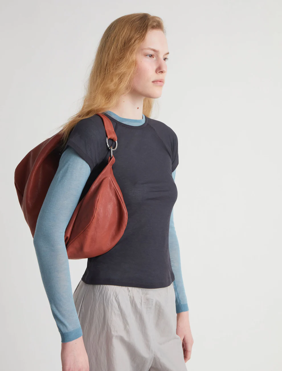Elongated, wrap-around hobo-style shoulder bag.