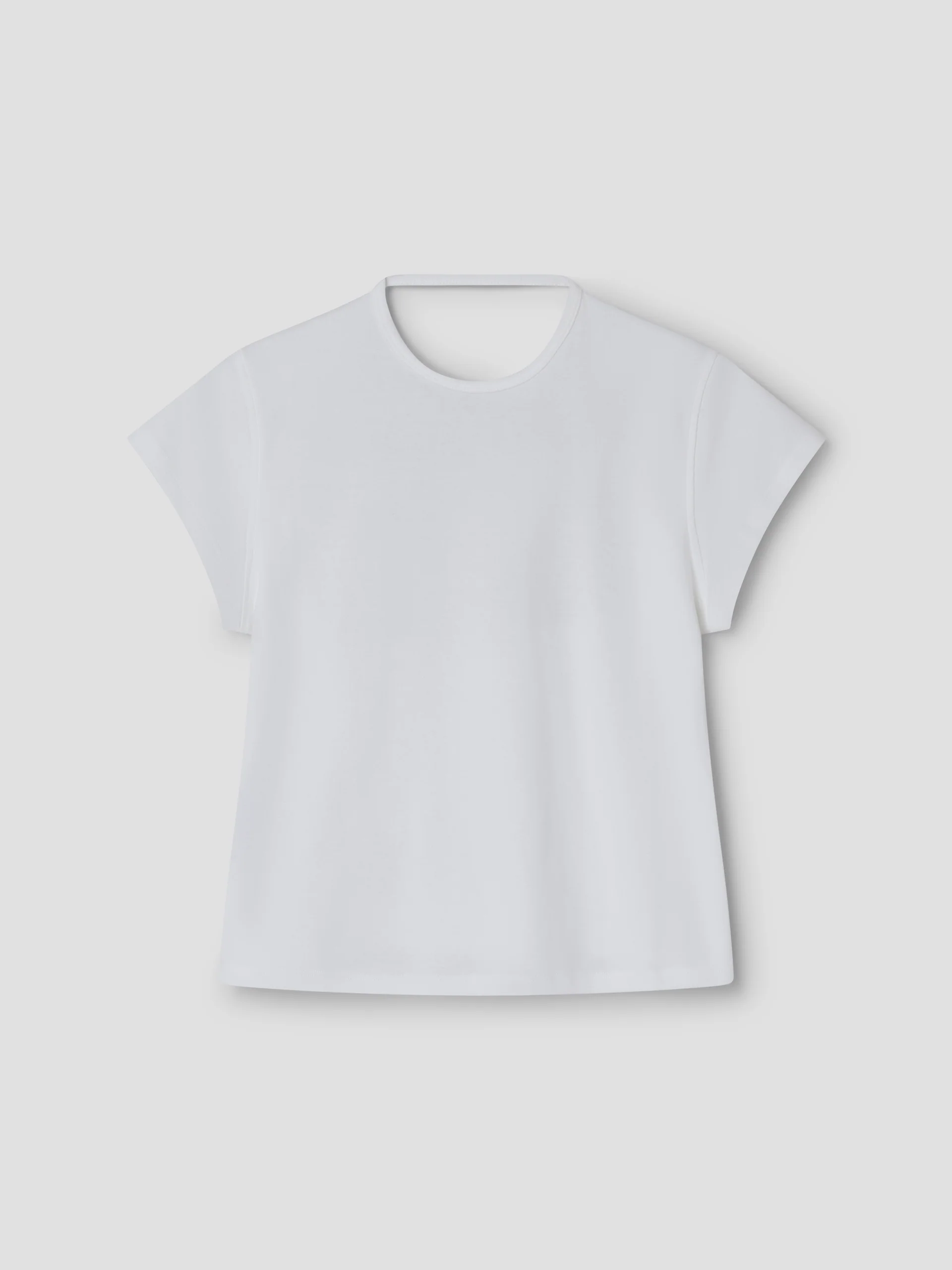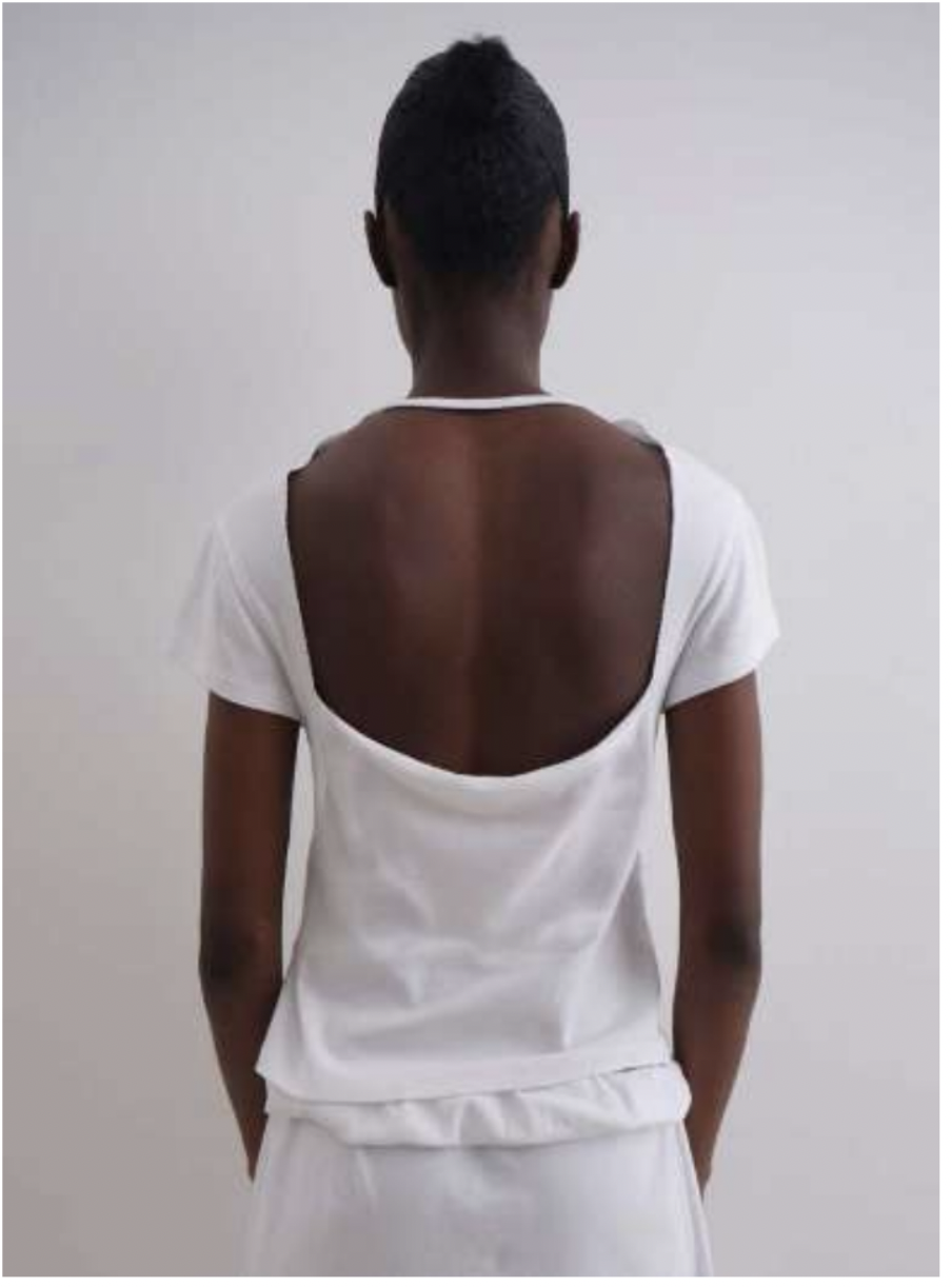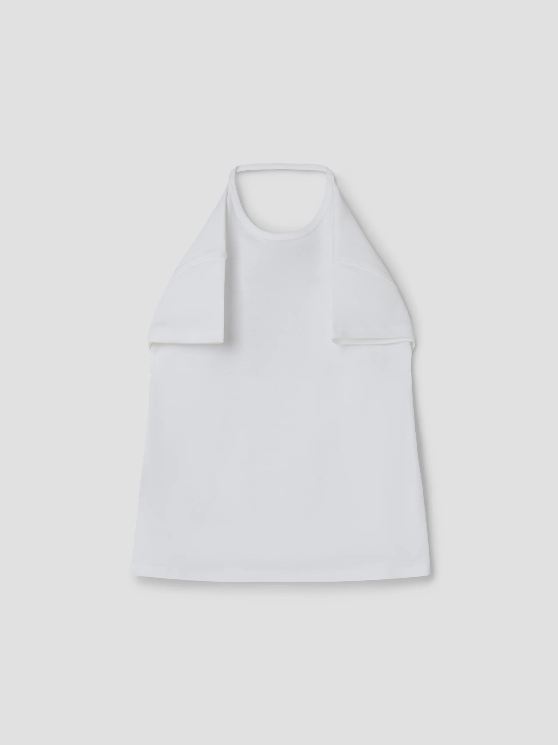 Women’s top in white with a soft cotton texture Rounded neckline and an open square back Can be worn as a halter or with sleeves extended.