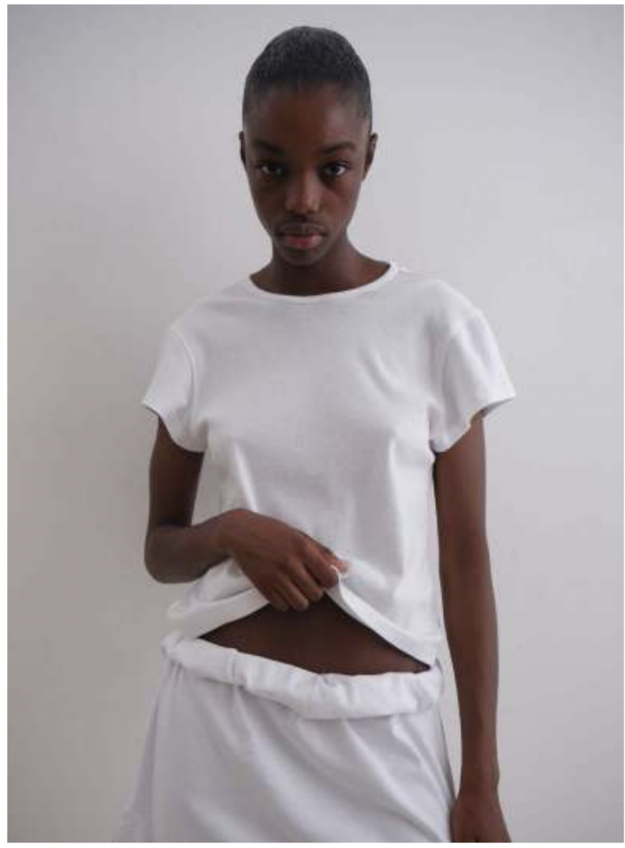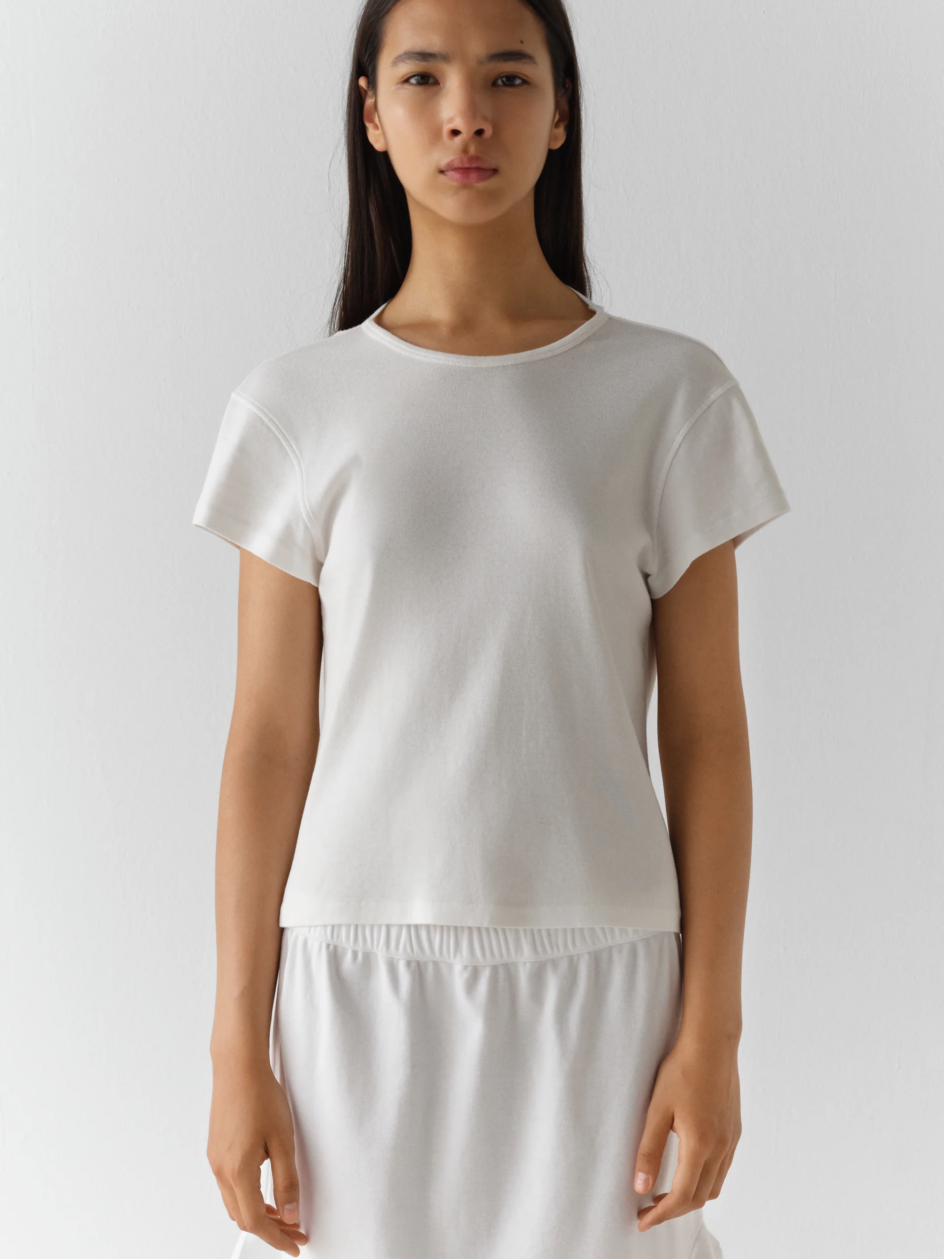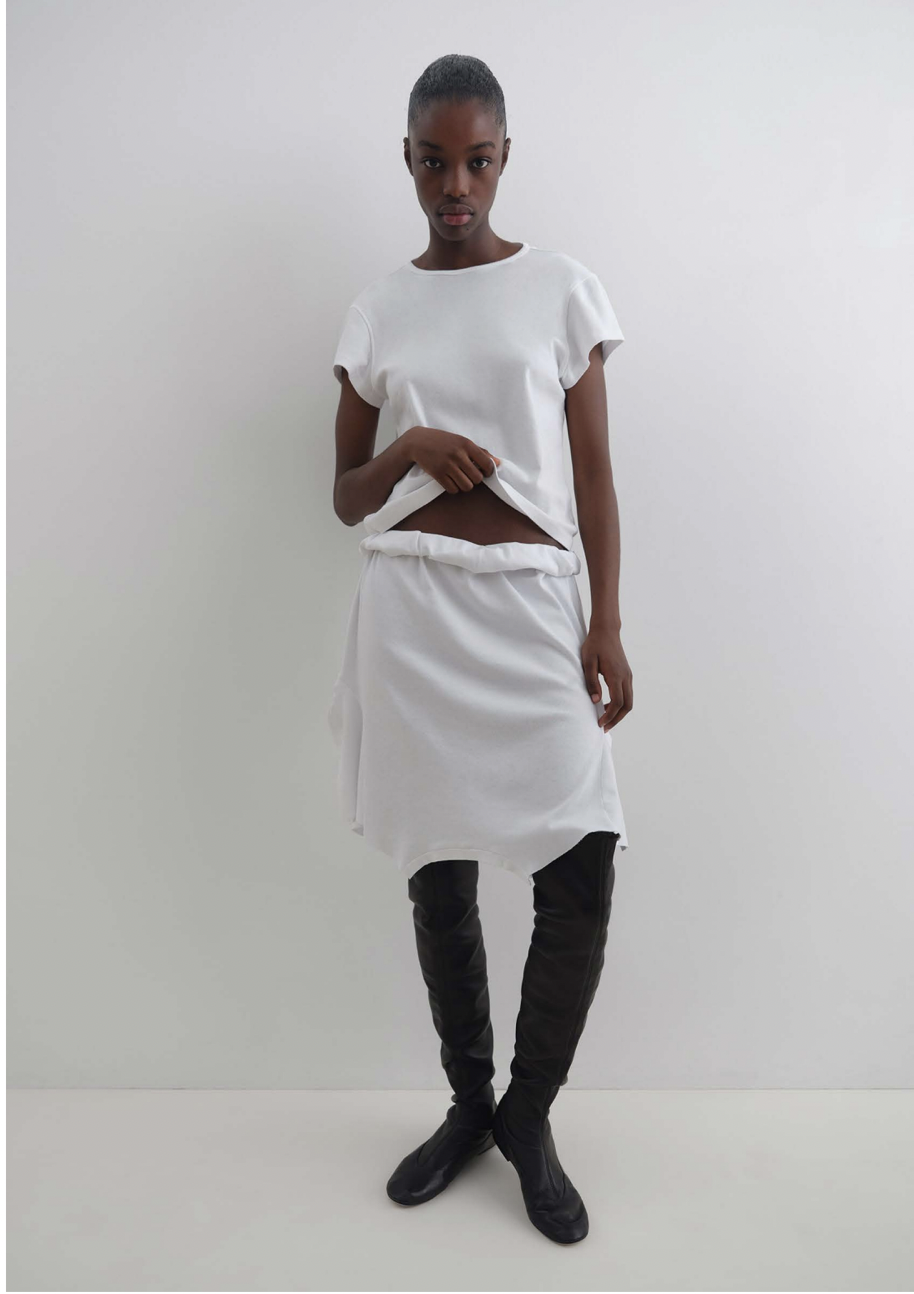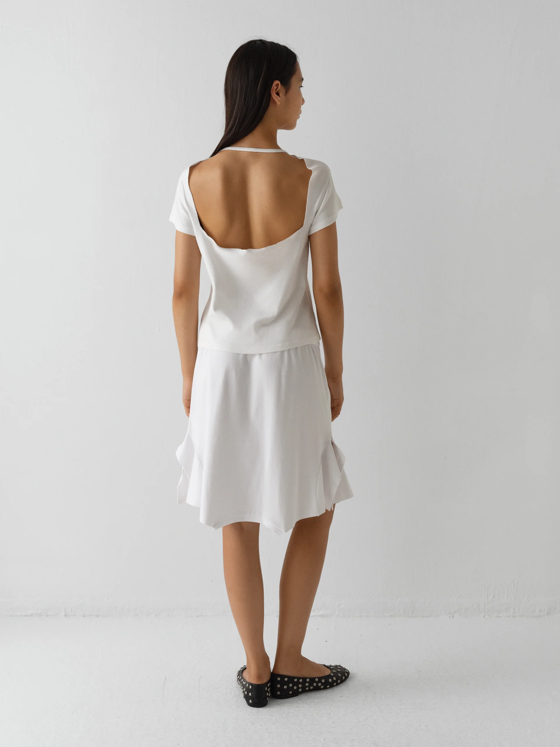 Women’s top in white with a soft cotton texture Rounded neckline and an open square back Can be worn as a halter or with sleeves extended.