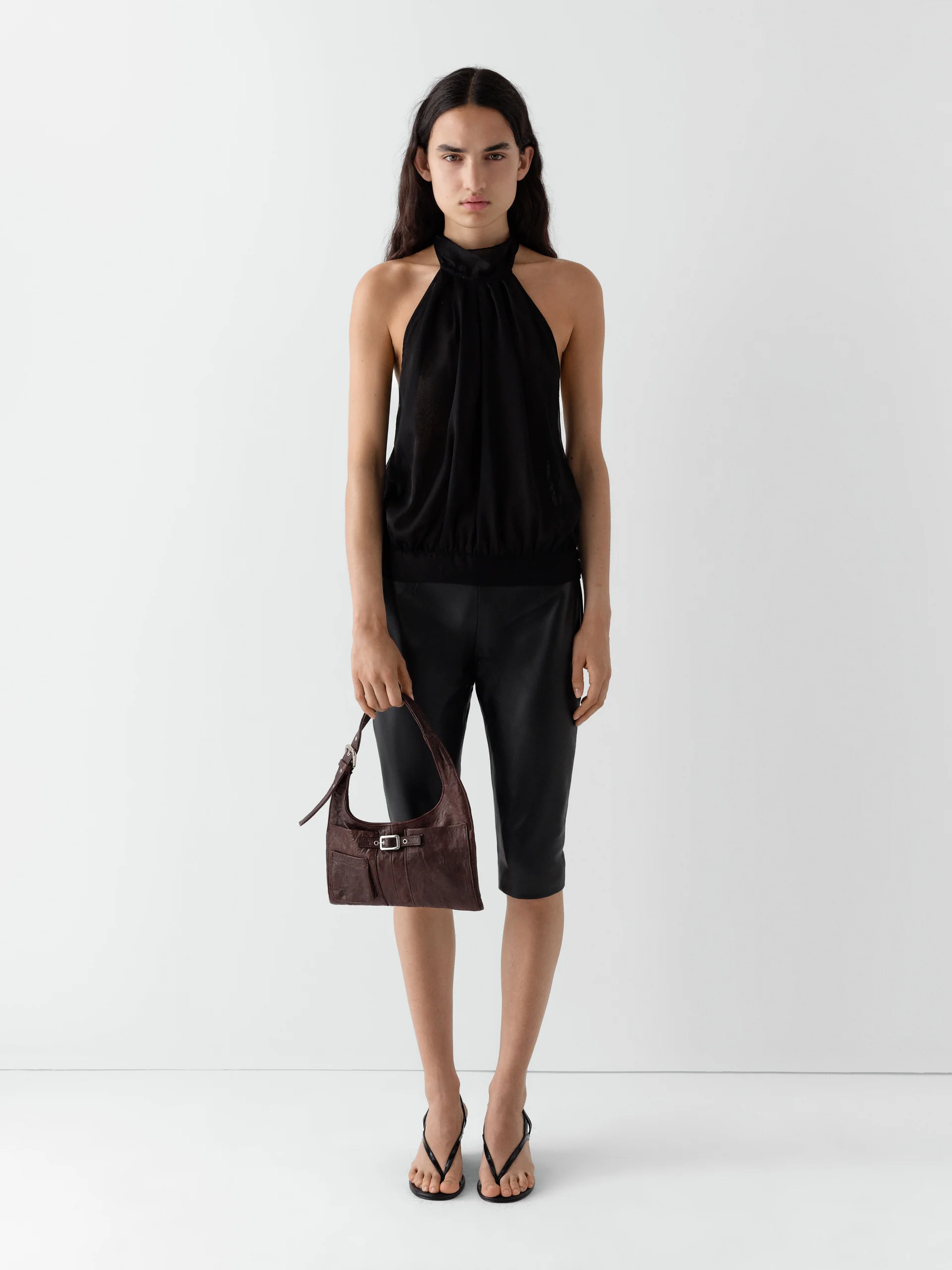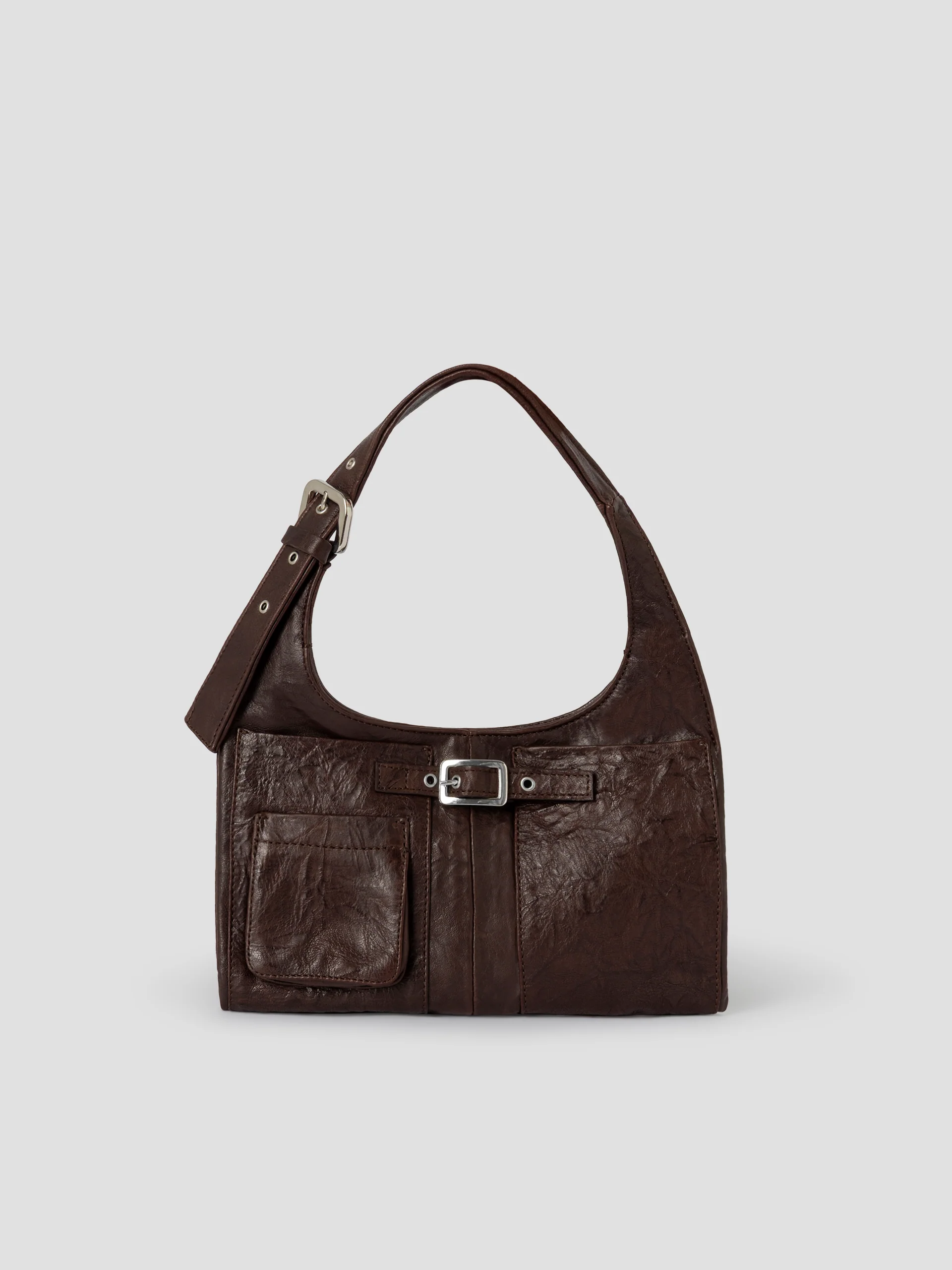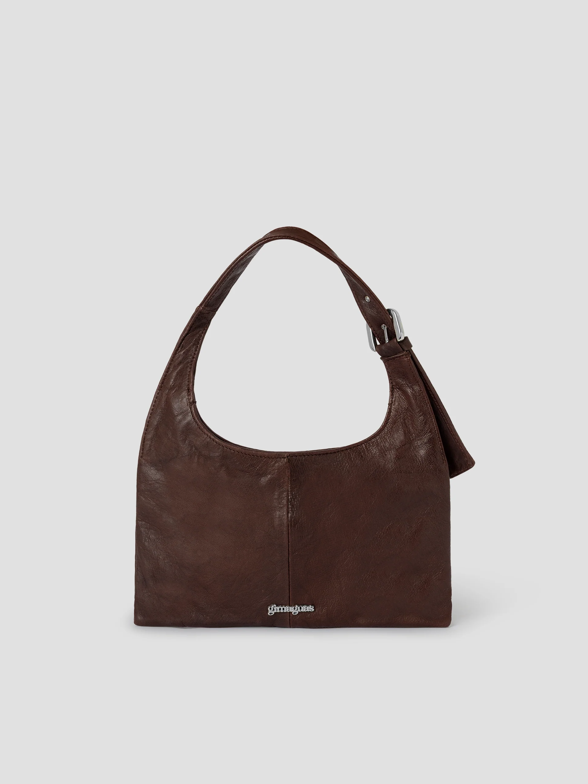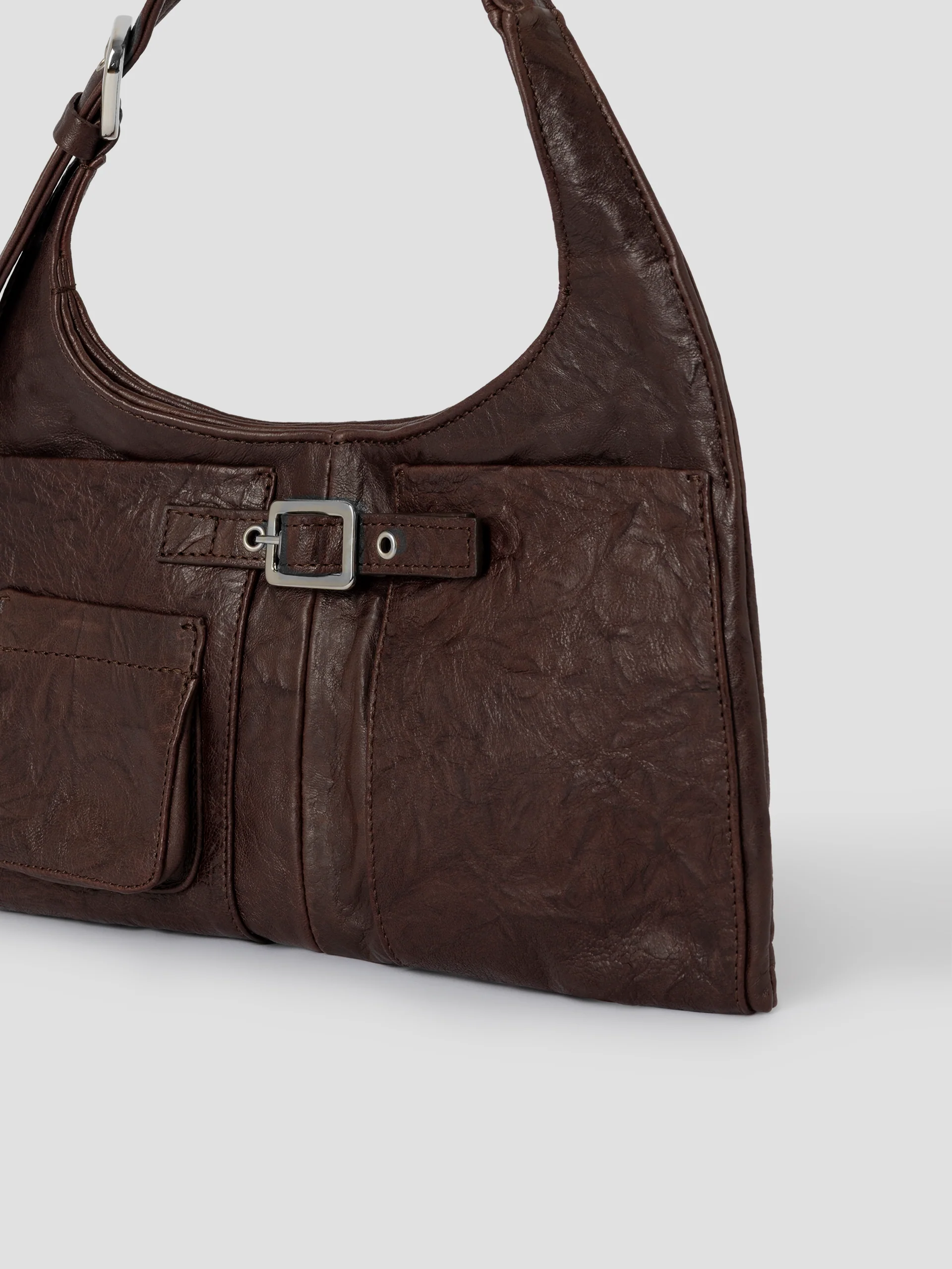 Compact women’s bag crafted from soft, crinkled brown lamb leather.