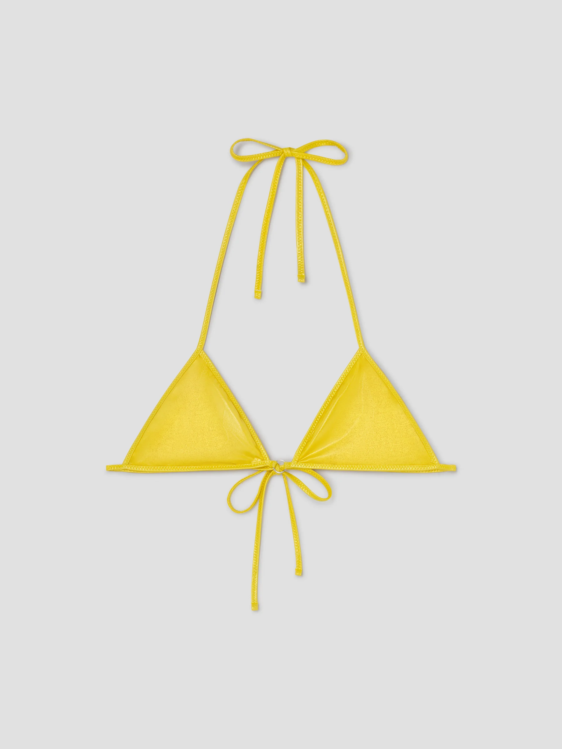 Yellow bikini top with a subtle metallic sheen and front ring detail.