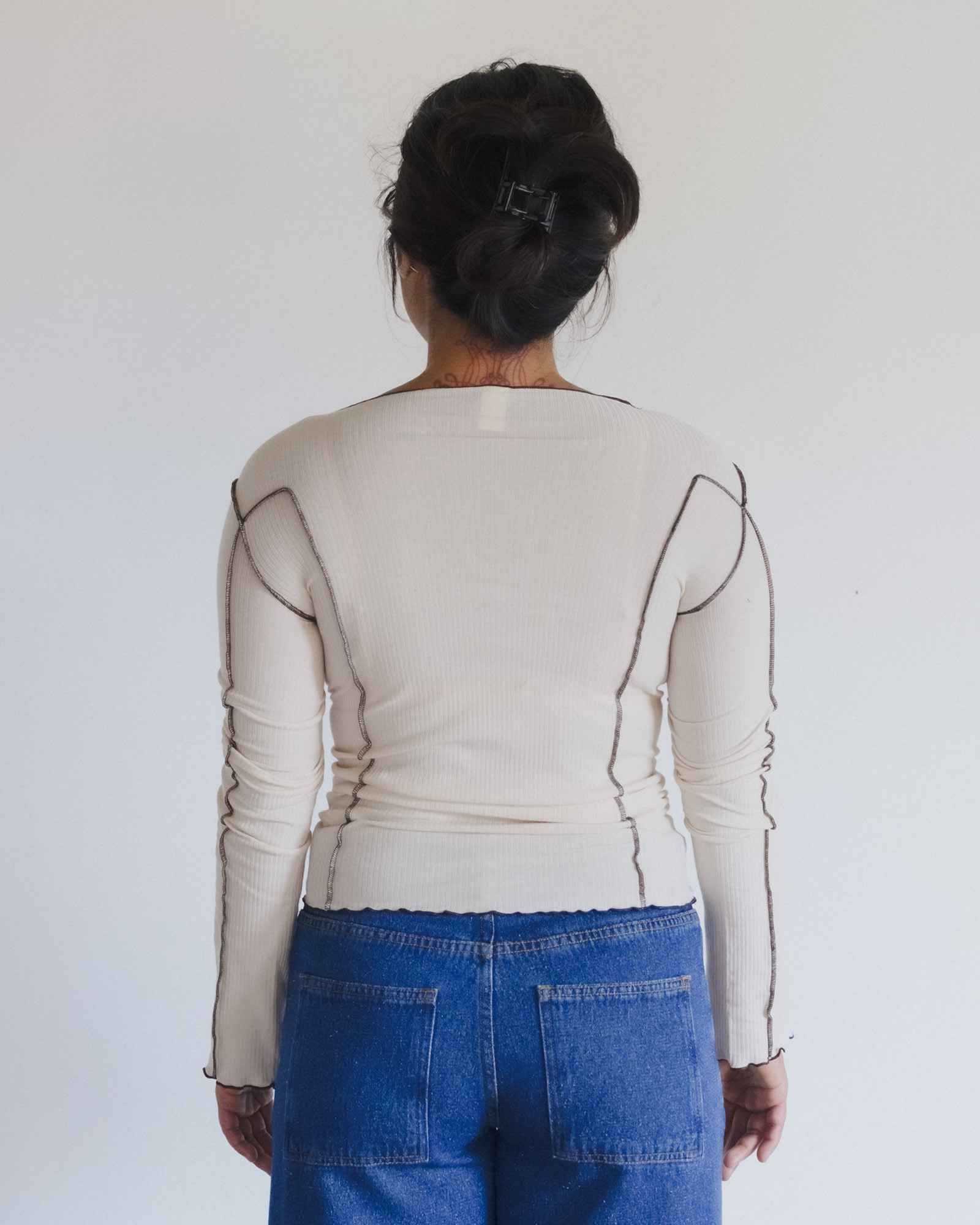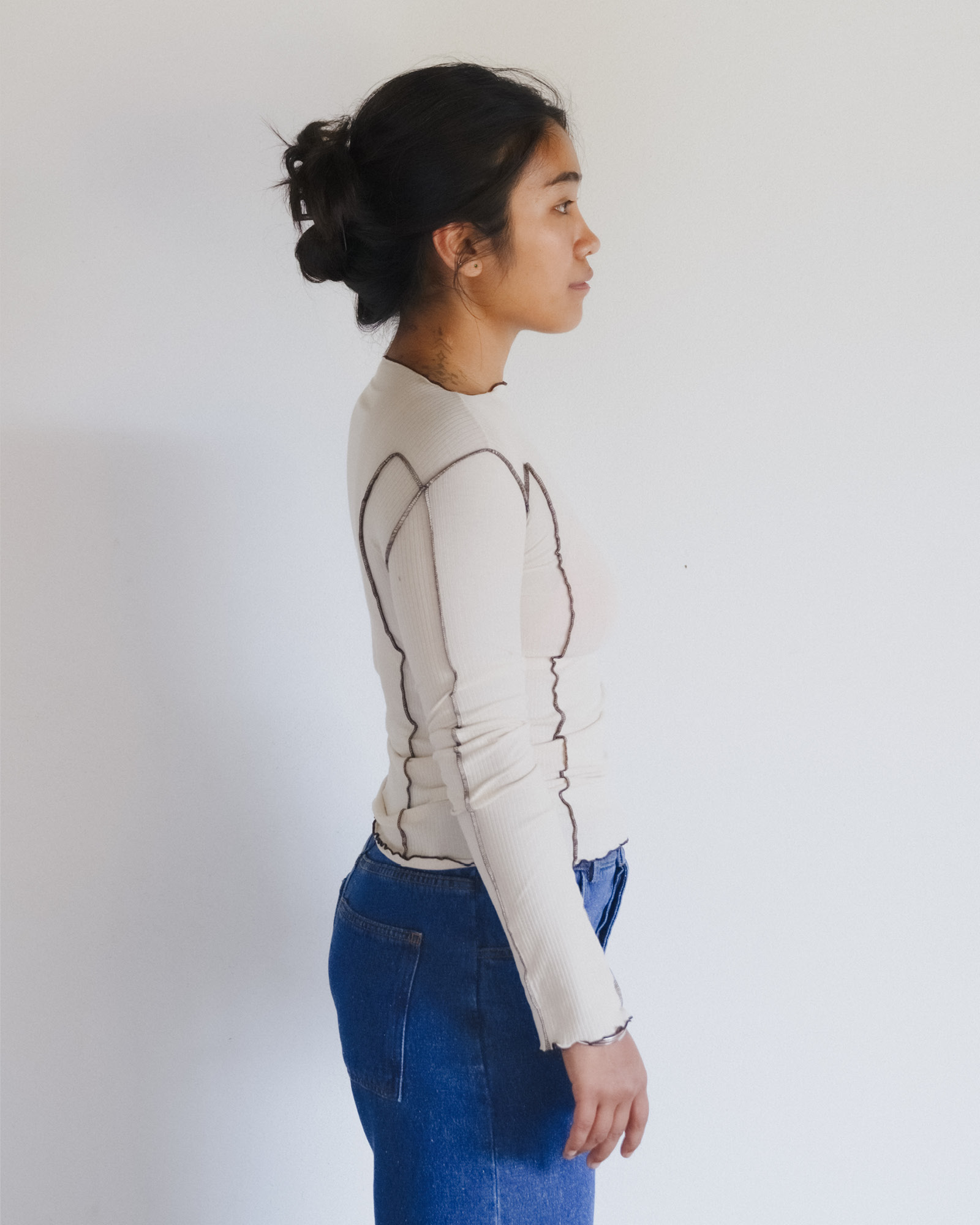 Organic cotton rib long sleeve Boatneck Exposed contrast seams Lettuce edge at neckline and hems